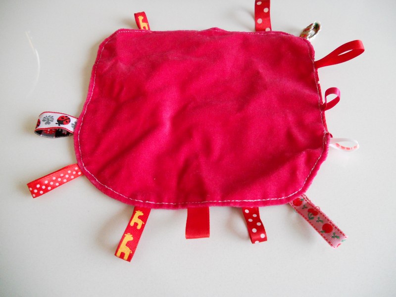 Nog nodig: een labeldoekje, want elk speeltje wordt zorgvuldig onderzocht naar waar zich het labeltje bevindt en hoe snel we dat in ons mondje kunnen steken.